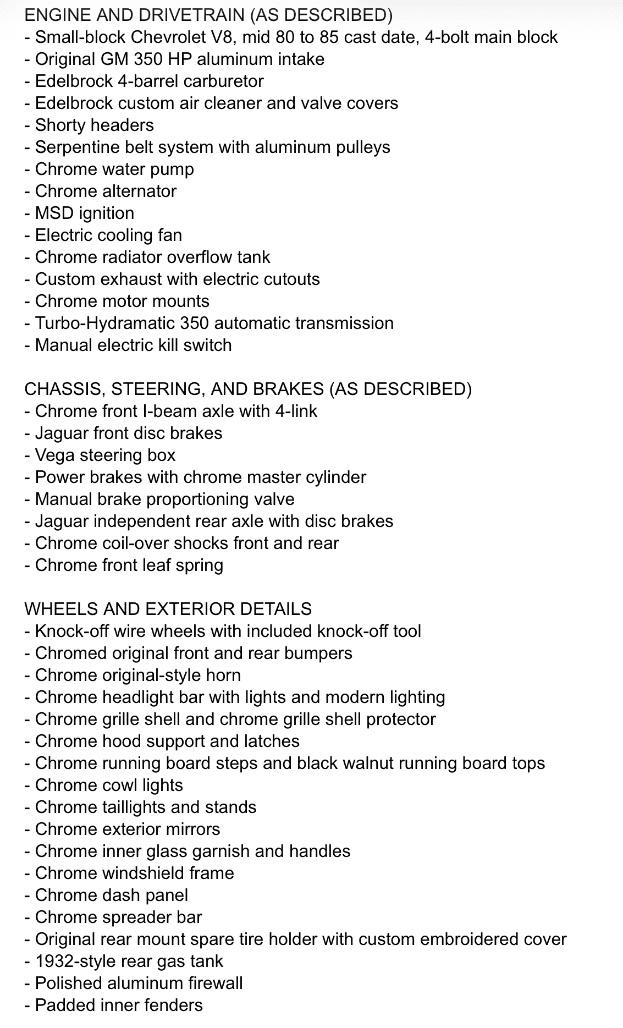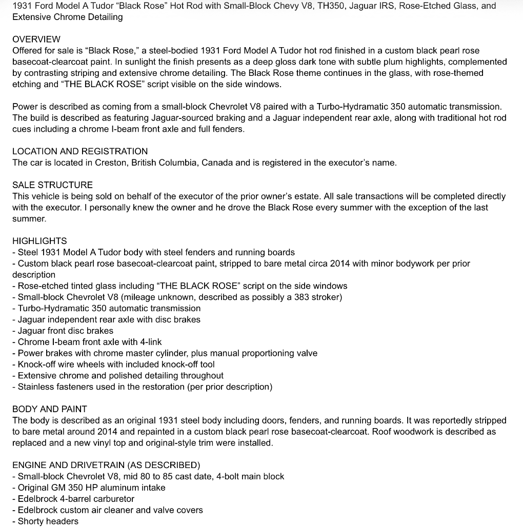 Real 1931 Ford Model A Tudor streetrod, [ The Black Rose ] not chopped, lots of head room and a full custom interior, 16000 miles on the car since built , VDO gauges, Tilt column and complete rewire, etched glass, Paint is custom Black Pearl Rose base clear this car pops in the sun light. Model A chassis with dropped front axle and disc brakes, rear is Jaguar independent with disc brakes, 350CI [ 350HP ] with a Turbo 350 Auto, Knock off wire wheels and as new rubber, lots of chrome throughout, Vega steering box, 4 Link, chrome coil overs front and rear, 1932 rear fuel tank, padded inner fenders, polished aluminum firewall, make your offer on this all steel show stopper. Reply for owners contact info, ships World wide.More photos and more detailed info in the add..