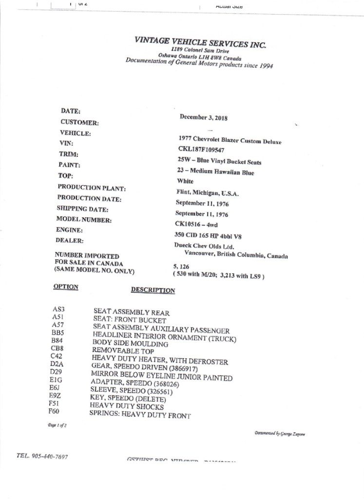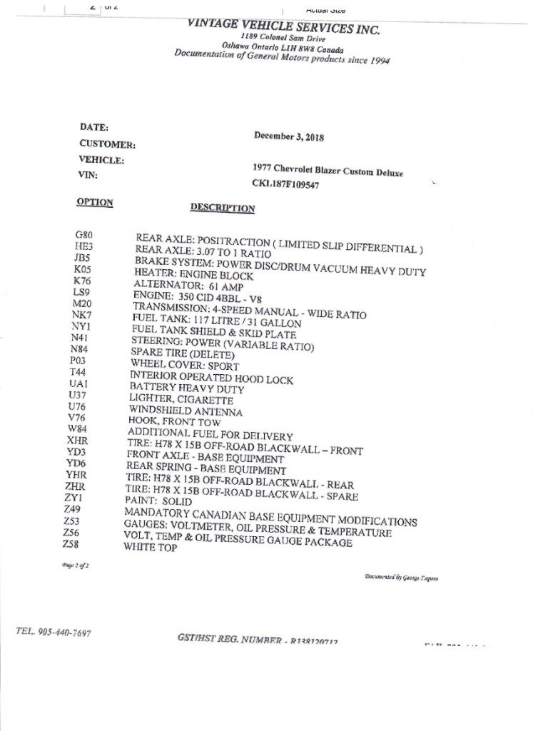 1977 Chevrolet Blazer K5 350 CID 4 Speed. dual exhaust Flowmaster, Aluminum wheels & TA’s, Ramsey Winch, roof rack. Stereo. Nice driver. GM Historical Vehicle docs. Asking $27,500.00 Please contact for more information and photos. Reply for owners contact #, Factory Build Sheet attached